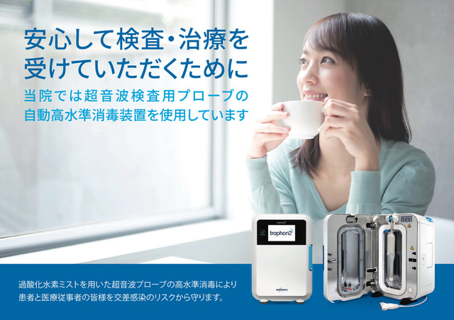 そこで当院は、徳島県内の産婦人科開業医としては初めて、経膣プローブの高水準消毒が可能な機器、『trophon2 (トロフォン2)』を導入しました。海外では広く使用されており、日本でも有名病院を中心に使用施設が増えてきています。当院も、患者様が安心して診療を受けられるクリニックであり続けたいと考え、導入しました。